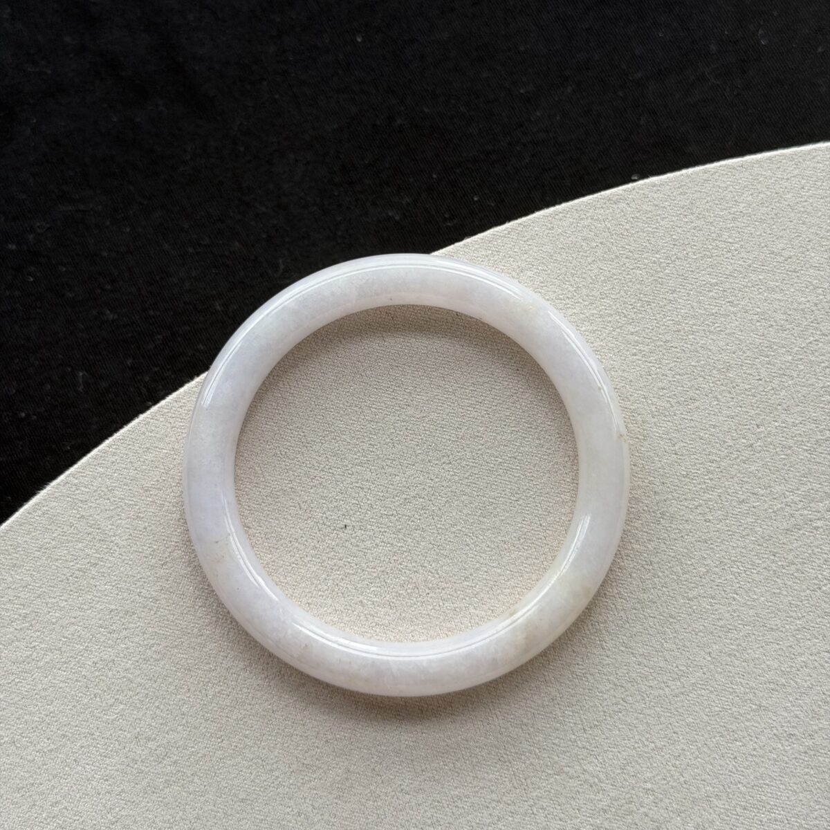 This translucent jadeite features a primarily Lavender & White palette. In traditional culture, lavender & white represents purity, clarity, and serene beauty. it represents a clean heart. The Bangle shape is known for Completion and Harmony – the full round shape symbolizes a life without obstacles.
