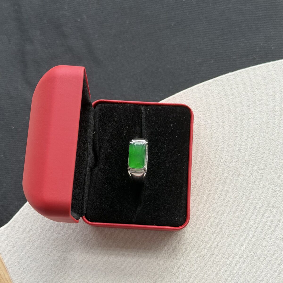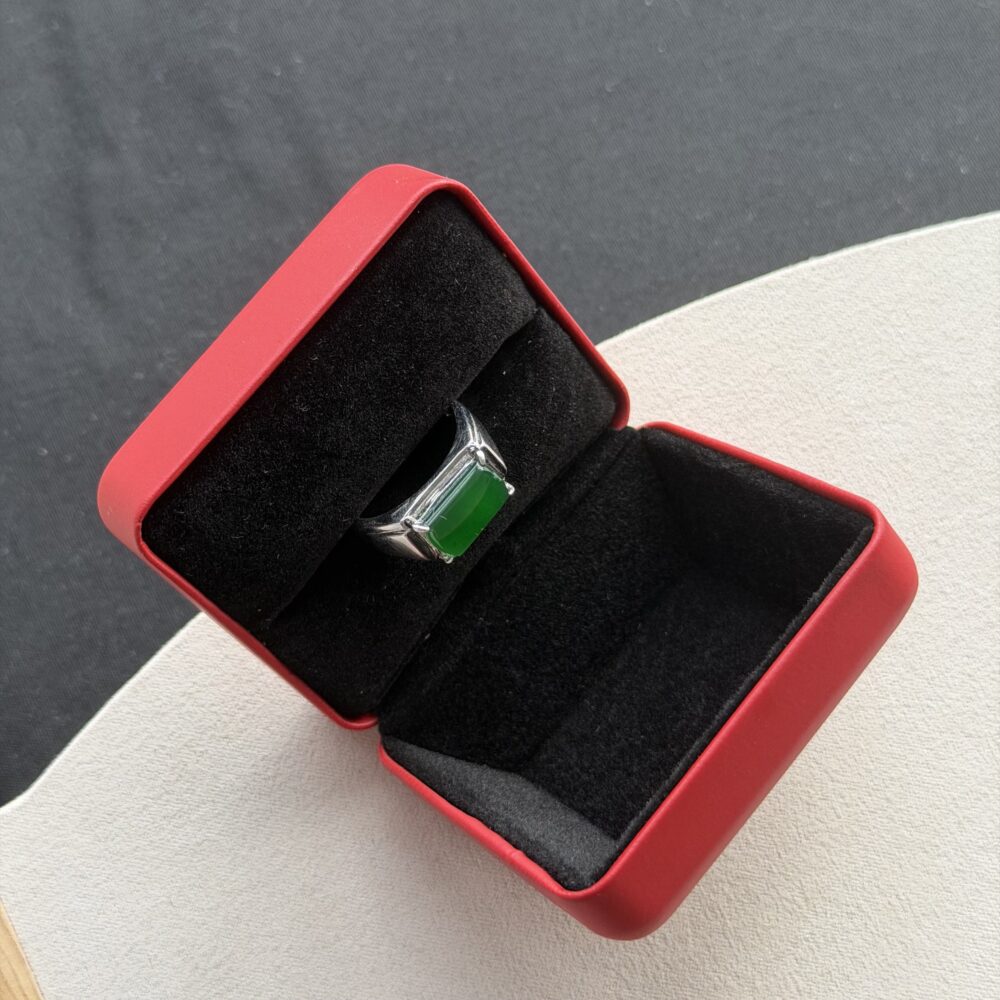 This rare rectangular-cut natural jadeite ring is a statement of architectural elegance and saturated ‘Imperial Green’ color quality. The precise geometry of the cut highlights the jadeite’s uniform texture and vibrant natural glow.