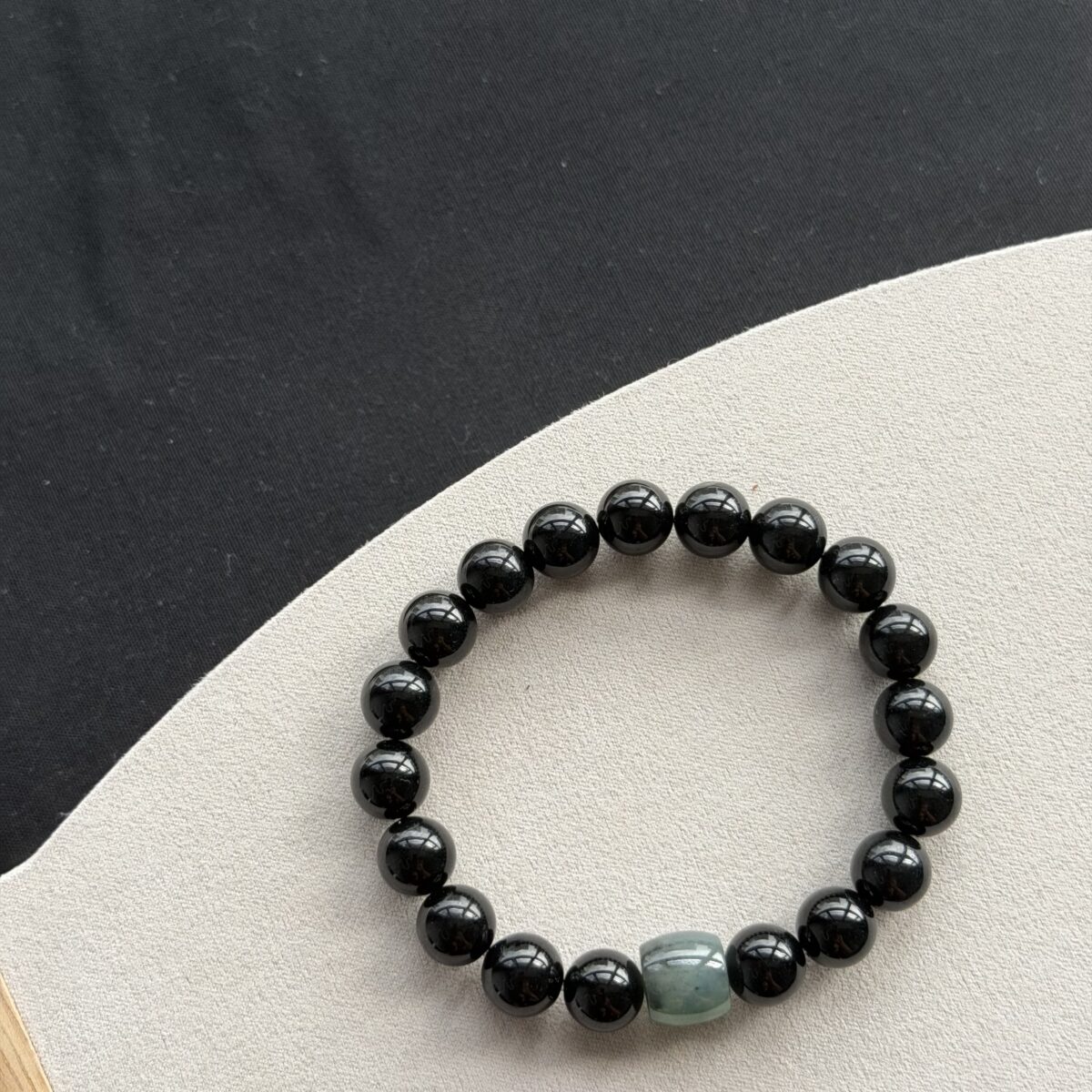 This natural jadeite features a primarily Natural Jadeite & Jadeite palette. In traditional culture, natural black jadeite & jadeite represents power, depth, and protection. symbolizing inner strength. The Focal Bracelet shape is known for Inner strength and protection paired with natural elegance.